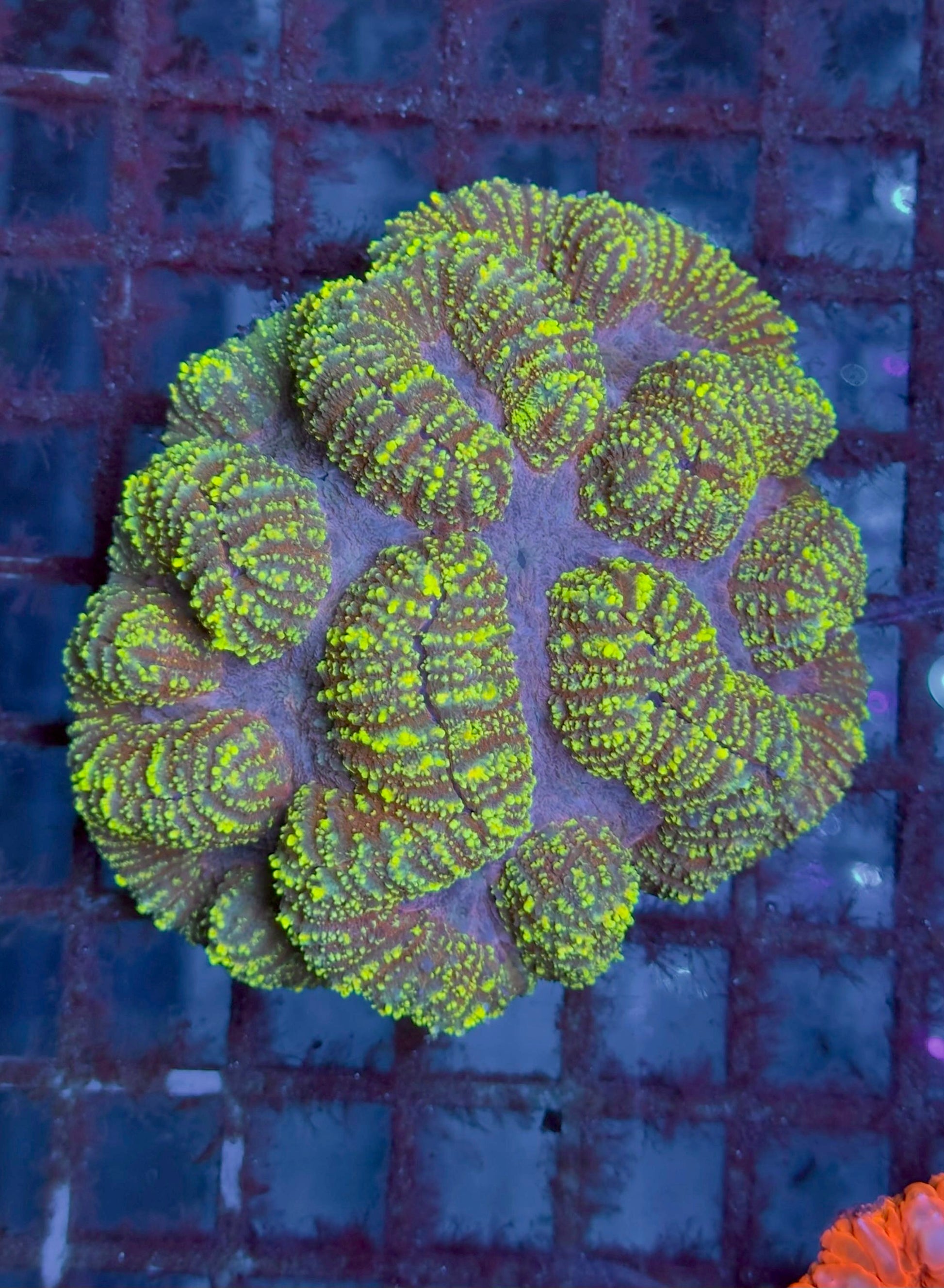 Un coral impactante y de gran tamaño, famoso por su vibrante coloración amarilla intensa que cubre completamente su superficie carnosa y sus pliegues característicos. Sus pólipos grandes y expandidos crean un efecto visual voluminoso y brillante, ideal como pieza central en acuarios de arrecife. Es un coral resistente dentro de los LPS, pero requiere espacio suficiente debido a su potencial crecimiento y su naturaleza semi-agresiva hacia corales cercanos.