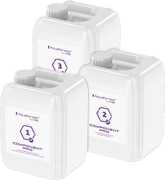 Dosis: Todos los fluidos deben dosificarse equitativamente según el consumo de Ca, KH y Mg. Analice el agua regularmente y establezca la dosis óptima según los resultados del análisis. Con una población promedio de corales SPS, la dosis recomendada de Components Pro es de 12 ml por 100 litros de agua al día. Si los parámetros del agua no se encuentran dentro del rango recomendado, utilice uno de los aditivos de Aquaforest Lab (Ca Plus, Mg Plus, KH Plus) hasta alcanzar los niveles deseados. Componente 1 Pro contiene: Ca, Sr, Fe, Mn, Cu, Zn, Ni, Cr, Co, Mo (25 ml/100 l incrementan el Ca en 9 ppm). Componente 2 Pro contiene: HCO₃, F, I (25 ml/100 l incrementan el KH en 1,3 dKH – Alk 0,46 meq/l). El Componente 3 Pro contiene: sales minerales, Mg, S, K, B, Sr, Li (25 ml/100 l aumentan el Mg en 0,76 ppm). Debido a la alta concentración del producto, se recomienda un mantenimiento regular de las líneas de dosificación.