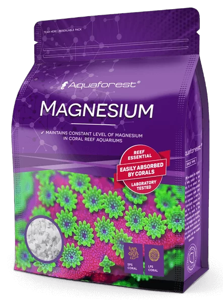 Un agente para aumentar los niveles de magnesio en acuarios de arrecife. El magnesio es esencial para el correcto desarrollo de los corales. Un nivel bajo de magnesio puede causar la incapacidad de mantener un nivel adecuado de calcio y un pH demasiado bajo. El nivel recomendado de magnesio en acuarios de arrecife es de 1180-1460 mg/l (ppm).