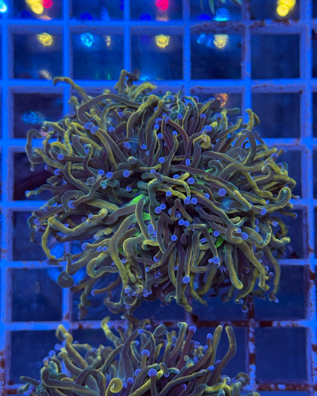 Una variedad excepcional y de aspecto majestuoso del género Euphyllia, caracterizada por sus tentáculos gruesos y ramificados que recuerdan a un dragón mitológico, con colores intensos que combinan tonos verdes, púrpuras o dorados con puntas contrastantes en amarillo, azul o rosa. Sus tentáculos presentan un movimiento fluido y ondulante que crea un efecto hipnótico en el acuario. Como la mayoría de Euphyllia, es semi-agresiva y debe mantenerse con espacio suficiente para evitar conflictos con corales vecinos.