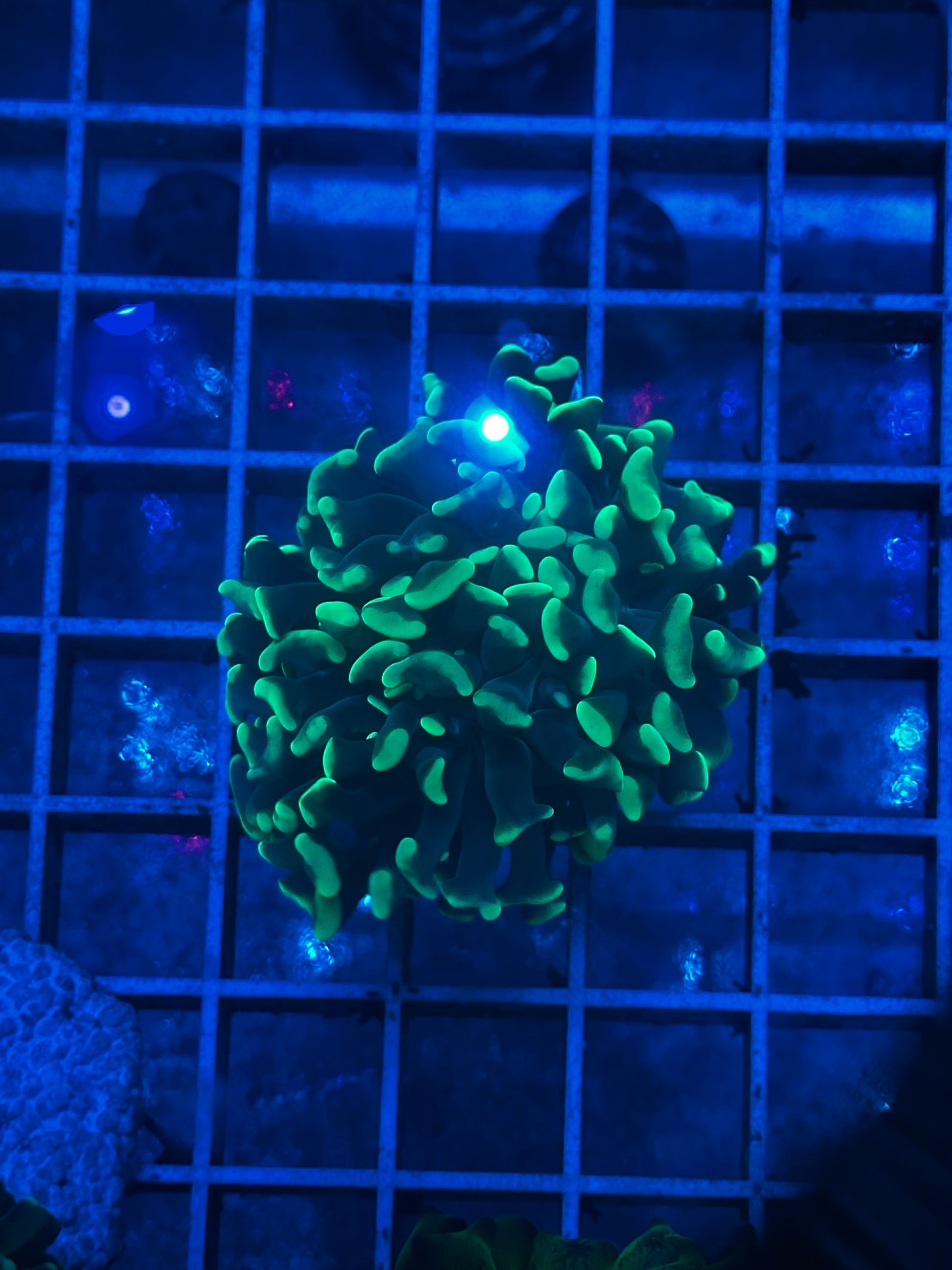 Una variedad luminiscente del coral martillo (Euphyllia ancora), caracterizada por sus tentáculos de color base verde oscuro que culminan en puntas brillantes de un intenso verde neón, creando un contraste espectacular que resplandece bajo luz actínica. Las puntas fluorescentes parecen "encenderse" con la iluminación adecuada, mientras sus tentáculos en forma de ancla o T se balancean suavemente con la corriente. Como es típico del género, es semi-agresivo y requiere espacio suficiente para evitar conflictos con corales vecinos.
