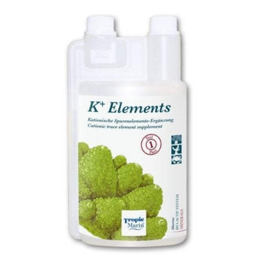 Tropic Marin® K+ ELEMENTS está repleto de oligoelementos catiónicos esenciales para favorecer el crecimiento óptimo y la coloración natural de los corales. Los oligoelementos son minerales naturales requeridos por los habitantes del acuario para los procesos biológicos activos, especialmente por los corales e invertebrados para el crecimiento del esqueleto. Estos elementos están presentes en cantidades minúsculas en el agua de mar y son consumidos rápidamente por el crecimiento de los corales y otros procesos. Por lo tanto, la suplementación regular de estos oligoelementos es esencial.