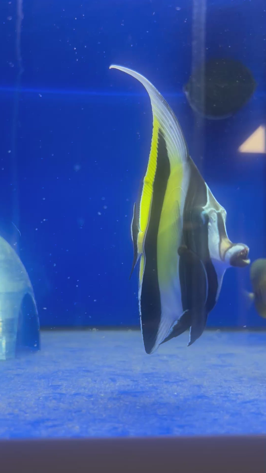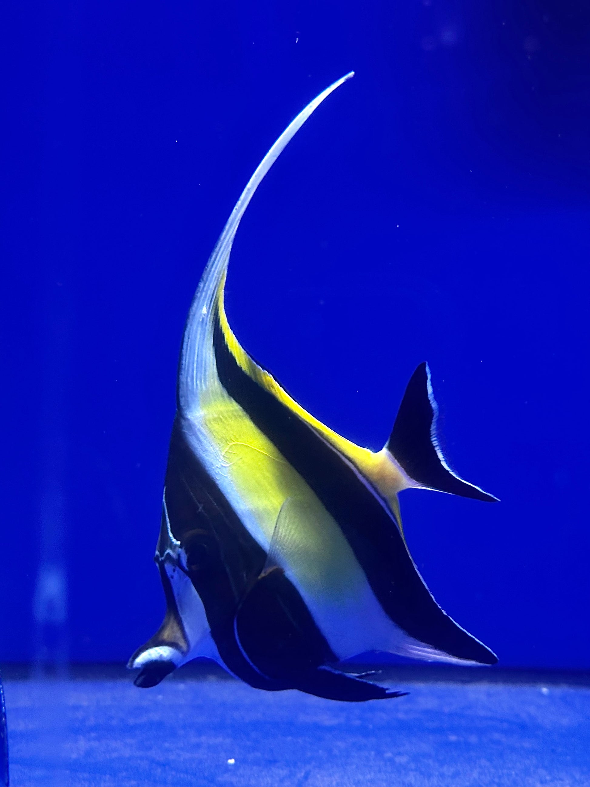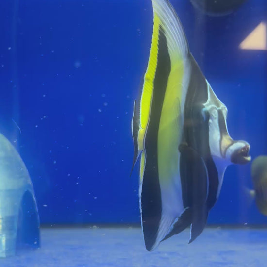 Uno de los peces más icónicos y desafiantes de la acuariofilia marina, reconocido por su cuerpo comprimido de color blanco y negro con franjas verticales, y un largo y elegante apéndice filamentoso en la aleta dorsal. Presenta un llamativo parche amarillo en el hocico y alrededor de la base de la aleta caudal. A pesar de su belleza, es un pez extremadamente delicado con una tasa de supervivencia baja en cautiverio, debido principalmente a sus exigentes requisitos dietéticos y su sensibilidad al estrés.